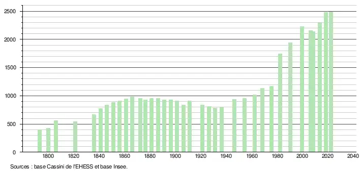 L'évolution du nombre d'habitants est connue à travers les recensements de la population effectués dans la commune depuis 1793. Pour les communes de moins de 10 000 habitants, une enquête de recensement portant sur toute la population est réalisée tous les cinq ans, les populations de référence des années intermédiaires étant quant à elles estimées par interpolation ou extrapolation[35]. Pour la commune, le premier recensement exhaustif entrant dans le cadre du nouveau dispositif a été réalisé en 2008[36].