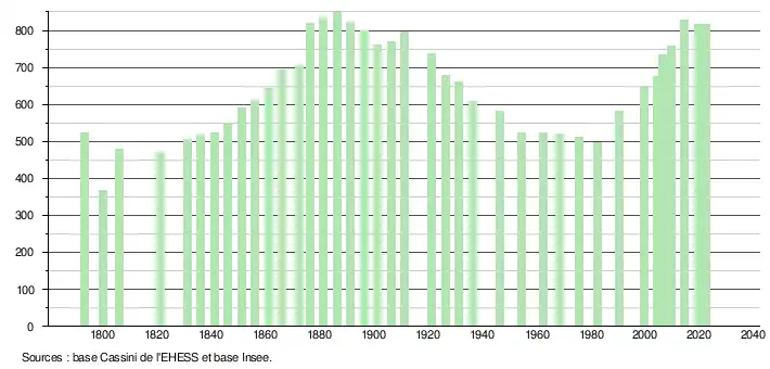 L'évolution du nombre d'habitants est connue à travers les recensements de la population effectués dans la commune depuis 1793. Pour les communes de moins de 10 000 habitants, une enquête de recensement portant sur toute la population est réalisée tous les cinq ans, les populations de référence des années intermédiaires étant quant à elles estimées par interpolation ou extrapolation[15]. Pour la commune, le premier recensement exhaustif entrant dans le cadre du nouveau dispositif a été réalisé en 2004[16].