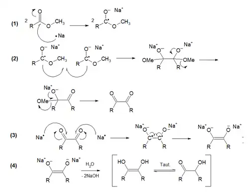 - les radicaux libres des deux molécules se couplent (de type couplage de Würtz) formant un dérivé homolytique des deux esters. Cette formation est suivie de deux éliminations d'alkoxy, une de chaque côté, menant à une 1,2-dicétone ;