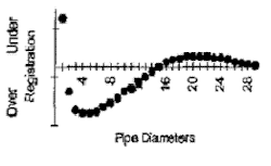 Dans l'équation (3), les longueurs de tuyau requises sont significatives, d'où le besoin de dispositifs capables de conditionner l'écoulement sur une longueur de tuyau plus courte, permettant ainsi aux ensembles de mesure d'être compétitifs en termes de coût et précis. Ici, le profil de vitesse d'écoulement est généralement tridimensionnel. Normalement, la description ne nécessite pas d'indication d'orientation axiale si le profil est asymétrique et s'il existe, alors une orientation axiale par rapport à un plan de référence approprié est requise. L'asymétrie existe en aval des effets d'installation tels que les coudes ou les tés. Habituellement, le profil de vitesse d'écoulement est décrit sur deux plans à 90° l'un de l'autre. En utilisant la dernière technologie logicielle, une description complète de la section transversale du tuyau du profil de vitesse est possible à condition que suffisamment de points de données soient fournis.