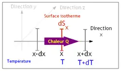 Nous pouvons exprimer le transfert thermique selon Ox pendant un temps dt. On suppose que la quantité de chaleur traversant une surface d'aire dSx est proportionnelle à dSx, au temps de transfert dt et au taux de variation de la température T :