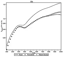 La conductivité translationnelle d'un mélange gazeux de corps est solution d'un système algébrique linéaire d'ordre et de rang [4],[6]. Elle s'exprime donc sous la forme où est la fraction volumique de l'espèce dans le mélange. Il existe nombre d'approximations précises dans un domaine plus ou moins large (voir figure ci-contre). Elles sont généralement basées sur une approximation de la solution formelle sous forme d'une série de déterminants. On obtient ainsi[7] :