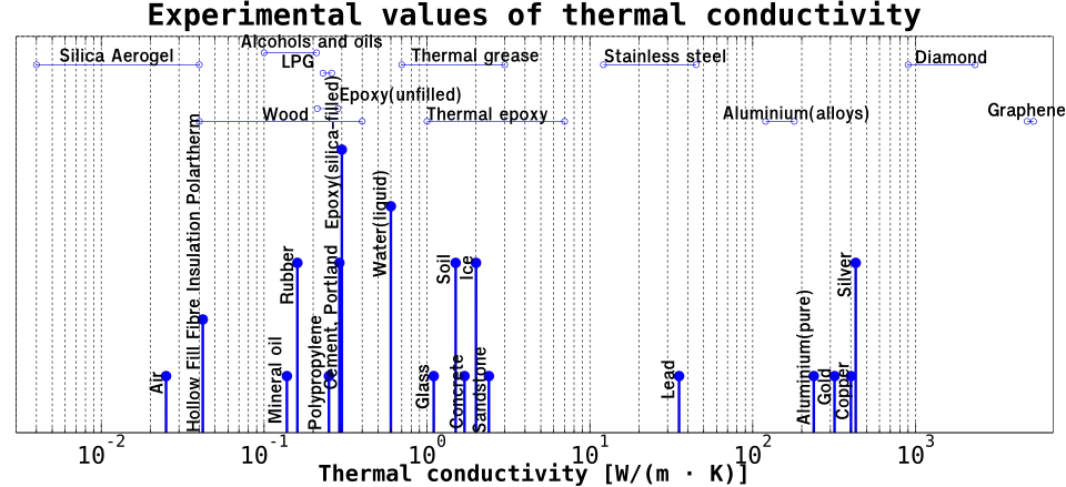 Plus la conductivité thermique est élevée, plus le matériau est conducteur de chaleur ; plus elle est faible, plus il est isolant. Le cuivre, avec une conductivité thermique de 380 W m−1 K−1, est ainsi plus de 10 000 fois plus conducteur de la chaleur que le polyuréthane (0,023 W m−1 K−1)[3].