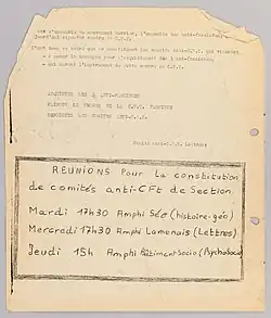 Tract du Comité anti-CFT appelant à réunions étudiantes.