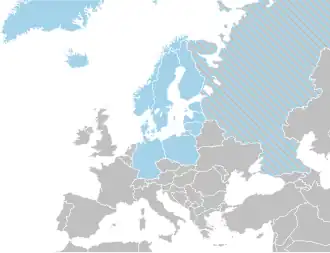 Carte des parlements membres (en bleu) de la Conférence parlementaire de la mer Baltique.