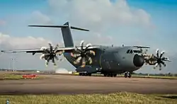 - les avions militaires de transport de fret (type Airbus A400M) ont un diamètre et une longueur de fuselage permettant d'accueillir des gros véhicules comme des chars. Ils sont munis d'une rampe de chargement à l'arrière et parfois d'un nez ouvrant ou basculant pour disposer une seconde rampe de chargement avant (type C-5 Galaxy). Cette disposition permet le chargement sans moyen de levage, par simple roulement, et éventuellement le déchargement sans faire de marche arrière ;