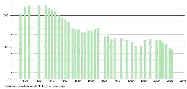 L'évolution du nombre d'habitants est connue à travers les recensements de la population effectués dans la commune depuis 1793. Pour les communes de moins de 10 000 habitants, une enquête de recensement portant sur toute la population est réalisée tous les cinq ans, les populations de référence des années intermédiaires étant quant à elles estimées par interpolation ou extrapolation[16]. Pour la commune, le premier recensement exhaustif entrant dans le cadre du nouveau dispositif a été réalisé en 2004[17].