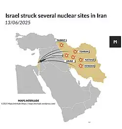 Le 13 juin 2025, Israël bombarde massivement l'Iran, ces « frappes préventives » selon Tel-Aviv, visant le programme nucléaire iranien, les infrastructures énergétiques du pays, des usines de missiles balistiques, la capitale Téhéran ainsi que des hauts-gradés des gardiens de la révolution et des forces armées iraniennes. En riposte, l'Iran procède à des bombardements contre Israël. Les deux pays procèdent par la suite à des attaques répétées de drones et de missiles, visant des cibles militaires comme des civils.