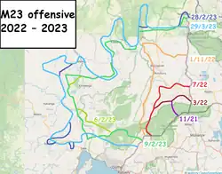 En , le Mouvement du 23 mars (M23) lance plusieurs offensives mineures contre les positions des Forces armées de la république démocratique du Congo (FARDC) et des membres de l’Institut congolais pour la conservation de la nature (ICCN) près de la frontière entre la république démocratique du Congo (RDC), le Rwanda et l'Ouganda[20],[23],[1]. Ces attaques donnent peu de résultats, le M23 ne bénéficiant plus de soutien international significatif. L'Ouganda et la RDC ont grandement amélioré leurs relations, coopérant contre un ennemi commun, les Forces démocratiques alliées (ADF), lors de l'opération Shujaa. Début 2022, un nombre croissant de combattants du M23 commencent à quitter leurs camps, et à retourner en RDC[18]. Le mouvement rebelle lance d'autres attaques entre et , lesquelles sont repoussées[23],[29].