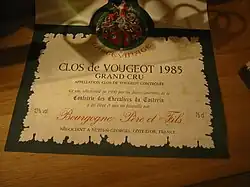 Depuis 1950, la confrérie des chevaliers de Tastevin organise dans le cellier du Château du Clos de Vougeot une séance de Tastevinage deux fois par an, au printemps et à l'automne. Le Tastevinage est présenté par la confrérie comme étant un label de qualité destiné à donner une plus grande visibilité aux vins de Bourgogne, que ce soit en France ou à l'étranger. Son but est de sélectionner les vins les plus représentatifs de la région.