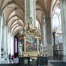 Elle comporte un petit autel surmonté d'un imposant retable de marbre sculpté et partiellement doré avec en son centre un tableau. Ce tableau, représentant la Crucifixion, est attribué au peintre flamand Guillaume Hergosse (XVIIIe siècle), il provient du couvent amiénois des religieuses fontevristes du Prieuré de Moreaucourt. De part et d'autre du tableau se trouvent, à droite, une statue de saint Louis, roi de France, portant la couronne d'épines dans la main droite, l'épée au côté, la main gauche sur un bouclier, à gauche, la statue de saint Roch accompagné de son chien, œuvre de Nicolas Blasset datée de 1634. La statue de saint Louis fut refaite en 1832 par les Frères Duthoit. Au-dessus de l'ensemble a été placée une statue de saint Sébastien transpercé de flèches, la tête entourée de chérubins. De chaque côté du sommet du tableau, encadrant, en contrebas, saint Sébastien se trouvent deux statues : la Justice, reconnaissable à la balance qu'elle sert contre elle et la Paix portant une corne d'abondance. Les trois saints, saint Louis, saint Roch et saint Sébastien, étaient invoqués lors des épidémies de peste[18]. Les balustrades sont en marbre noir à balustres de cuivre.