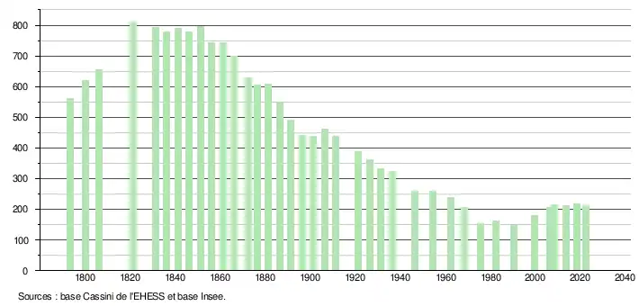 L'évolution du nombre d'habitants est connue à travers les recensements de la population effectués dans la commune depuis 1793. Pour les communes de moins de 10 000 habitants, une enquête de recensement portant sur toute la population est réalisée tous les cinq ans, les populations de référence des années intermédiaires étant quant à elles estimées par interpolation ou extrapolation[18]. Pour la commune, le premier recensement exhaustif entrant dans le cadre du nouveau dispositif a été réalisé en 2008[19].