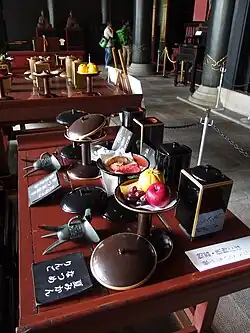 La liturgie du sekiten (釈奠) connait des évolutions dans le second quart du Xe siècle. Le code Engishiki qui est achevé en 928 et promulgué en 967 complète les protocoles déjà couverts par le code de Taihō de 701 et le Code Yōrō de 757. C'est le code le plus ancien qui nous soit parvenu pour lequel la totalité du contenu des rites confucianistes est connu[n 5]. Il présente une version mature de ce rite, fruits de plusieurs adaptations successives du Da Tang Kaiyuan li (zh) au contexte japonais, sans trop s'en départir sur sa forme générale, que ce soit pour le rituel pratiqué à la Daigaku-ryō ou ceux organisés en province. C'est sur de ce texte que les rénovations du rituel lors des siècles suivants vont se baser jusqu'à une réfome de Kansei en 1800[47]. Il conserve l'aspect grandiose de son modèle chinois : plus de 75 rôles liturgiques sont identifiables, et pas loin de 500 repas sont prévus pour le banquet principal[48]. Contrairement à son modèle chinois, la place du prince impérial à cette cérémonie est limité, et la figure de Confucius reste subordonnée à celle de la lignée impériale[49].