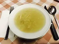 La canja est une soupe traditionnelle du Portugal et d'autres pays lusophones. Il s'agit d'un bouillon liquide de poulet avec du riz, mais non un riz coulant à la portugaise[42]. La canja de galinha, bouillon de poule, est servie chaude, elle est reconstituante (soupe pour femme enceinte). Il est d'usage de dire : « La canja au poulet et la prudence ne font de mal à personne[43]. » Le Novo Dicionário Aurélio da Língua Portuguesa (1986) donne comme origine du mot canja le malayalam kanji, langue parlée sur la côte de Malabar où se trouvait la colonie portugaise de Goa d'où ce terme se diffusa[44]. Personne n'a autant aimé la canja de poulet que Pierre II, empereur du Brésil[44]. Un décret fixant le régime alimentaire des hôpitaux militaires brésiliens (1874) donne une recette de canja de riz pour le déjeuner (riz 48 g, eau 250 g et sucre) et de canja de poulet pour le souper qui contient aussi du riz (riz 32 g, 1/4 de poulet et eau)[45].