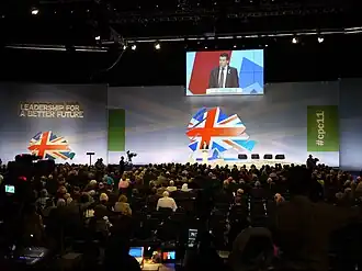 Le Congrès du Parti conservateur (Conservative Party Conference en anglais abrégé CPC) est un congrès national de quatre jours organisé par le Parti conservateur au Royaume-Uni. Il a lieu chaque année vers octobre, pendant la saison des congrès des partis britanniques, lorsque la Chambre des communes est généralement en vacances. Le lieu de l'événement alterne entre l'International Convention Centre (ICC) de Birmingham et le Central Convention Complex de Manchester depuis 2008. Auparavant, il alternait entre Blackpool et Bournemouth[1]. Contrairement au congrès du Parti libéral-démocrate, où chaque membre du parti participant à sa conférence, en personne ou en ligne[2], a le droit de voter sur la politique du parti, selon le système un membre, une voix[3],[4], ou à celui du Parti travailliste, où 50 % des voix sont attribuées aux organisations affiliées (telles que les syndicats) et dans laquelle les votes ne consistent qu'à nommer les représentants (appelés délégués)[5], le Congrès du Parti conservateur ne comprend pas de vote sur la politique du parti[6].