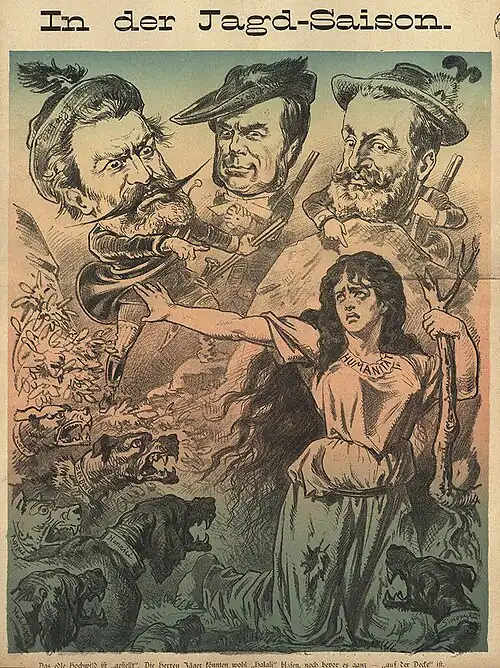 Initié par l'Allemagne wilhelmienne[1], ce mouvement antisémite moderne se développe également dans les deux empires voisins, la Russie, où éclatent des pogroms, et l'Autriche-Hongrie, où l'agitation antijuive, qui se manifeste avec violence lors de l'affaire de Tiszaeszlár, a pour principaux animateurs les députés hongrois Győző Istóczy (en) et Géza Ónody (d). Ces troubles entraînent une émigration massive des Juifs vers l'Ouest, et notamment vers l'Allemagne, où la xénophobie à l'encontre de ces migrants alimente l'antisémitisme extrémiste, qui reste cependant minoritaire[1].