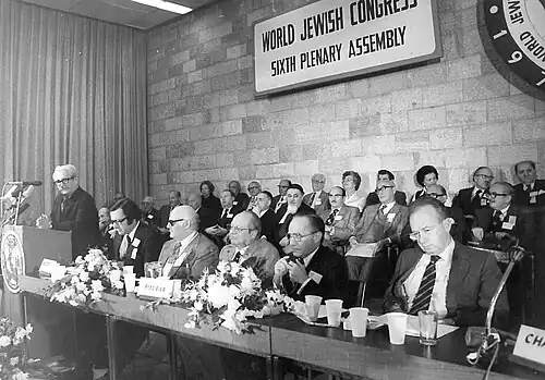 La première Conférence juive mondiale a eu lieu à Genève en août 1932. Le sioniste Nahum Goldmann dirigeait une commission préparatoire. C'était l'un des principaux défenseurs de la création d'un organe international représentant les Juifs[21]. Goldmann a défini comme suit l'objectif du Congrès juif mondial :