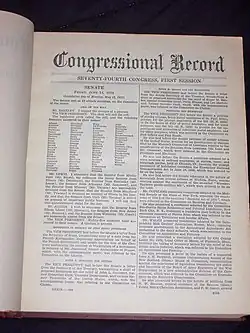 Le Congressional Record est le journal officiel des délibérations et débats du Congrès des États-Unis. Il est publié par le Bureau d'impression du gouvernement des États-Unis lorsque le Congrès est en session. Les index sont publiés environ toutes les deux semaines. A la fin d'une session du Congrès, les éditions quotidiennes sont compilées en volumes reliés constituant l'édition permanente. Le chapitre 9 du titre 44 du Code des États-Unis autorise la publication du Congressional Record .