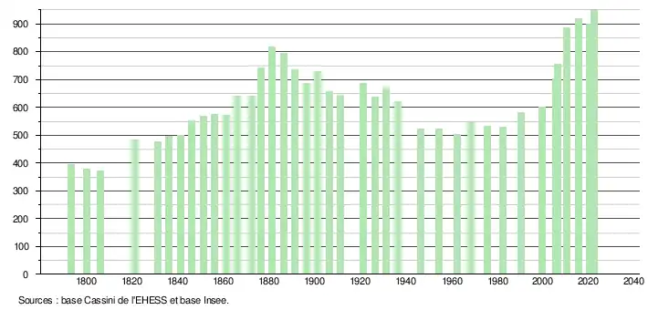 L'évolution du nombre d'habitants est connue à travers les recensements de la population effectués dans la commune depuis 1793. Pour les communes de moins de 10 000 habitants, une enquête de recensement portant sur toute la population est réalisée tous les cinq ans, les populations de référence des années intermédiaires étant quant à elles estimées par interpolation ou extrapolation[27]. Pour la commune, le premier recensement exhaustif entrant dans le cadre du nouveau dispositif a été réalisé en 2005[28].