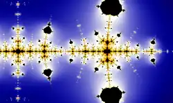 Dans le plan complexe, cette fonction a été étudiée par Letherman, Schleicher et Wood [21]. De nombreux points divergent à l'infini, représentés dans l'illustration ci-contre en jaune ou bleu. La frontière qui sépare ces régions divergentes et celles qui ne divergent pas, ici en noir, forme une courbe fractale. On y retrouve des éléments caractéristiques de l'ensemble de Mandelbrot (ce dernier résultat n'est pas très étonnant en fait, car cet ensemble est universel).