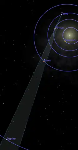 Certains mouvements planétaires permettent à des astres de se retrouver à la même coordonnée (ascension droite ou longitude céleste) sur un intervalle de temps court. Lorsque le phénomène concerne deux planètes supérieures, il a lieu lorsqu'elle sont en opposition à des dates proches. Dans l'exemple ci-contre, Mars est en opposition (indicateur 180°) le et Saturne, le 1er mars.