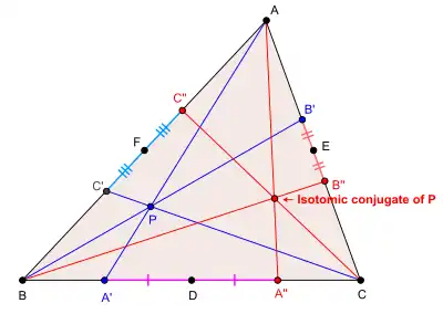 On considère un triangle ABC et un point P qui n'appartient pas aux droites (AB), (AC) et (BC). Les droites (PA), (PB) et (PC) rencontrent les côtés BC, AC et AB respectivement aux points A', B' et C'. On construit les points A'', B'' et C'', symétriques respectifs de A' par rapport au milieu de BC, B' par rapport au milieu de AC, et C' par rapport au milieu de AB. Les droites (AA''), (BB'') et (CC'') sont concourantes (d'après par exemple le théorème de Ceva) en un point qui est le conjugué isotomique de P par rapport au triangle ABC.