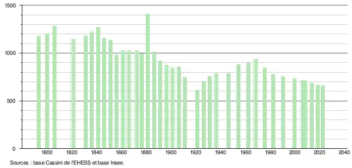 L'évolution du nombre d'habitants est connue à travers les recensements de la population effectués dans la commune depuis 1793. Pour les communes de moins de 10 000 habitants, une enquête de recensement portant sur toute la population est réalisée tous les cinq ans, les populations de référence des années intermédiaires étant quant à elles estimées par interpolation ou extrapolation[20]. Pour la commune, le premier recensement exhaustif entrant dans le cadre du nouveau dispositif a été réalisé en 2008[21].
