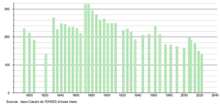 L'évolution du nombre d'habitants est connue à travers les recensements de la population effectués dans la commune depuis 1793. Pour les communes de moins de 10 000 habitants, une enquête de recensement portant sur toute la population est réalisée tous les cinq ans, les populations de référence des années intermédiaires étant quant à elles estimées par interpolation ou extrapolation[23]. Pour la commune, le premier recensement exhaustif entrant dans le cadre du nouveau dispositif a été réalisé en 2008[24].