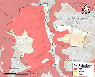 Les mouvements de terrains susceptibles de se produire sur la commune sont des tassements différentiels[36]. Le retrait-gonflement des sols argileux est susceptible d'engendrer des dommages importants aux bâtiments en cas d’alternance de périodes de sécheresse et de pluie[37]. 66,6 % de la superficie communale est en aléa moyen ou fort (58,6 % au niveau départemental et 48,5 % au niveau national métropolitain)[Carte 4]. Depuis le , en application de la loi ÉLAN, différentes contraintes s'imposent aux vendeurs, maîtres d'ouvrages ou constructeurs de biens situés dans une zone classée en aléa moyen ou fort[Note 4],[38].
