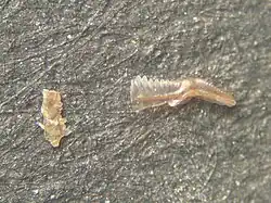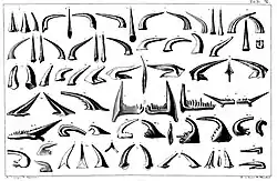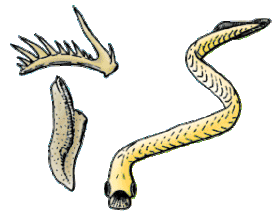 Note: Les protoconodontes, fossiles du Cambrien, sont des éléments dont la composition est de nature organique ou faiblement phosphatique. Certains membres sont interprétés comme des crochets fossilisés de chaetognathes par Hubert Szaniawski sur la base d'une analyse comparative assez détaillée[30],[23].