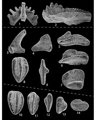 Les appareils des conodontes peuvent comporter un certain nombre d'éléments. Selon leur position et leur forme, ceux-ci portent les noms de spathognathiforme, ozarkodiniforme, trichonodelliforme, néoprioniodiforme, et autres noms[20].