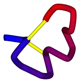 Représentation schématique de la structure tridimensionnelle de l'α-conotoxine PnIB de Conus pennaceus, colorée de l'extrémité N-terminale (bleu) à l'extrémité C-terminale (rouge). Les liaisons disulfures sont représentées en jaune. Créé à l'aide d'Accelrys DS Visualizer Pro 1.7 et de GIMP.
