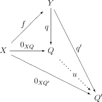 commute. De plus, le morphisme q doit être universel pour ce diagramme, c'est-à-dire que n'importe quel autre morphisme q′: Y → Q′ peut être obtenu en composant q avec un unique morphisme u : Q → Q′ :