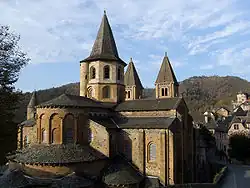 Cet édifice roman a été construit aux XIe et XIIe siècles ; les deux tours de façade datent du XIXe siècle. La partie qui fait la célébrité du lieu est le tympan. L'abbatiale conserve également un trésor comprenant des pièces d'art uniques de l'époque carolingienne. L'intérieur est décoré par des vitraux de Pierre Soulages.