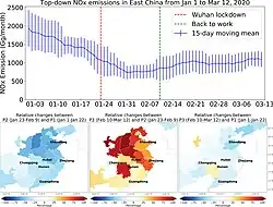 Une recherche conjointe réalisée par des scientifiques chinois et américains a estimé que les émissions d'oxydes d'azote (NOx=NO+NO2) ont baissé de 50 % dans l'est de la Chine entre le 23 janvier (confinement de Wuhan) et le 9 février 2020, comparé à la période du 1er au 22 janvier 2020[4]. Les émissions ont ensuite augmenté de 26 % entre le 10 février (jour de la reprise du travail) et le 12 mars 2020, indiquant une possible augmentation des activités socio-économiques après que la majorité des provinces aient autorisé les commerces à ouvrir[4]. Les mesures de contrôle du Covid-19 les plus efficaces pour contrôler la diffusion du virus avec un impact socio-économique moindre n'ont pas encore été étudiées[4].