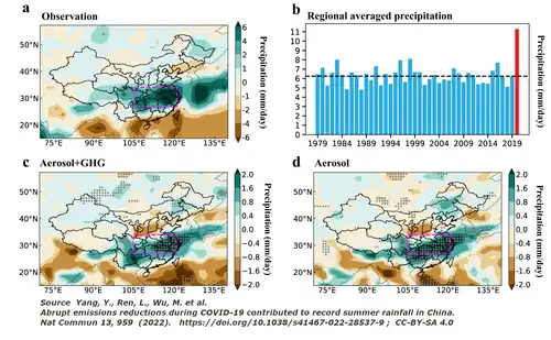 En 2020, la Chine orientale a enregistré son record historique de pluviométrie, battant le record précédent, daté de 1961[38],[39], et largement hors des fourchettes de variabilité naturelle. Des inondations estivales ont causé des centaines de morts et déplacé des millions de chinois. Cette anomalie a questionné les météorologues[40] ; Le 18 février 2022, une étude internationale (principalement sino-américaine, publiée dans le journal Nature)[41] a conclu que cette anomalie climatique était - au moins pour un tiers - expliquée par certains effets de la pandémie, le reste étant probablement dû à d'autres phénomènes (vents inhabituellement chauds et fort événement dipolaire dans l'océan Indien[39] ; retrait inhabituellement tardif du front Meiyu-Baiu, causé par le réchauffement accru de la mer d'Oman[42] ; transition de phase sous-saisonnière de l'oscillation nord-atlantique[38]).