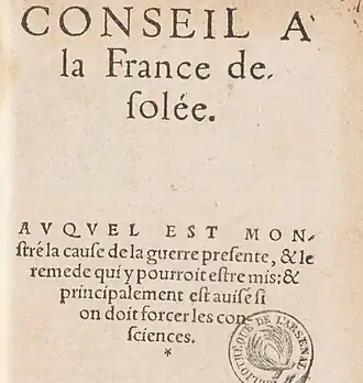 - ↑ Volker Mecking, « Sébastien Castellion, Conseil de la France desolée (1562): étude lexicale », UR CONFLUENCE : Sciences et Humanités (EA 1598), (lire en ligne, consulté le )