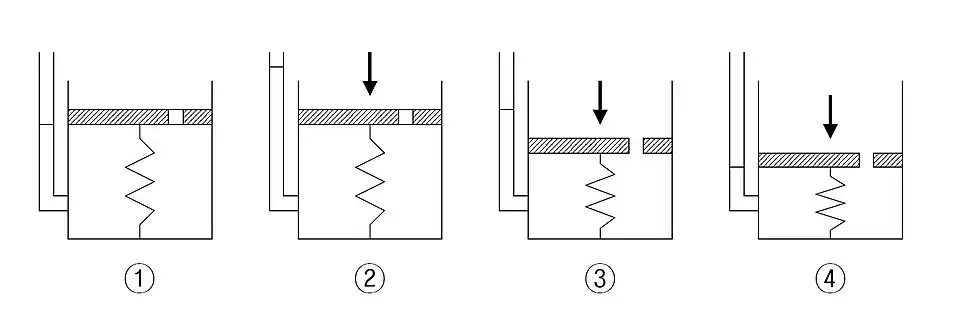 - Après un certain temps, le drainage de l'eau s'interrompt car le ressort fait équilibre à la charge appliquée. (Pleine dissipation de pression excédentaire d'eau interstitielle. Fin de la consolidation)