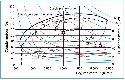 Pour analyser la consommation de carburant d'un moteur, il est pratique d'utiliser un diagramme du type joint[8] qui indique la consommation spécifique (grammes de carburant par kilowatt-heure) pour chaque couple (N m) et vitesse de rotation (tr/min). On observe sur un tel graphique appelé « cartographie moteur » qu'il existe plusieurs combinaisons possibles de couple et vitesse de rotation pour produire une même puissance (par exemple points de fonctionnement 1,2 et 3 du graphique joint).