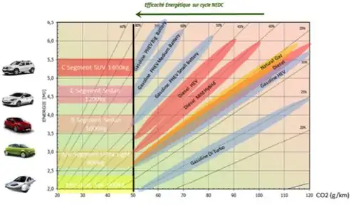 Il est pratique de présenter sur un même diagramme l'énergie nécessaire pour déplacer un véhicule sur un trajet donné (ordonnée) en fonction de la consommation de carburant ou des émissions de CO2 réalisées sur ce même trajet (abscisse). Cette représentation nommée « diagramme énergétique » permet de tracer des droites d'iso-efficacité énergétique qui correspondent aux différentes techniques de moteurs et ainsi d'estimer pour une catégorie de véhicule donnée les émissions de CO2 sur le trajet. L'exemple joint[9] montre que pour atteindre le seuil de 50 g de CO2 par kilomètre (soit environ 2 l/100 km) sur cycle Nouveau cycle européen de conduite avec un véhicule urbain (catégorie B), il faut utiliser un moteur hybride plug-in ou alors réaliser sur ce véhicule un allègement considérable.