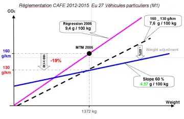 Les seuils sont définis selon un paramètre d'utilité qui est la masse moyenne des véhicules pour chaque constructeur. Le seuil de 130 gCO2/km en 2015 est donné pour une masse 1 372 kg qui correspond à la moyenne de la flotte européenne en 2006, mais les seuils varient pour chaque constructeur en fonction de la masse moyenne de la flotte de véhicules avec une pente de 4,57 gCO2/kg pour 100 kg[16]. Cette pente est inférieure à la pente « naturelle » que l'on obtiendrait avec de véhicules utilisant les mêmes techniques. Ainsi, la réglementation est plus exigeante pour les constructeurs qui commercialisent les véhicules les plus lourds et réciproquement.