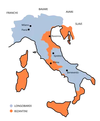 Les premières années du règne de Constant II sont marquées par la reprise de la guerre avec les Lombards, dont le royaume est de plus en plus solidement implanté au nord de la péninsule. Ainsi, en 642, le roi Rothari conquiert la Ligurie et la cité de Gènes puis vainc une armée byzantine l'année suivante, tuant possiblement l'exarque Isaac sans parvenir à prendre Ravenne pour autant[60]. Par la suite, une trêve est conclue avec Olympios, un des successeurs d'Isaac, probablement vers 650.
