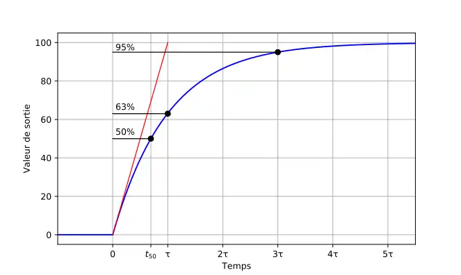 La sortie atteint 99,3 % de sa valeur en régime permanent après 5τ. Dans l'industrie, on utilise souvent le temps de réponse à 95 % qui correspond à une durée de 3τ.