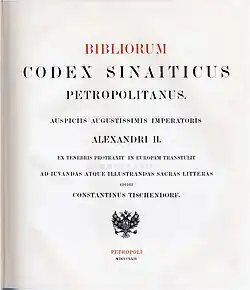 Après des tractations assez complexes, il est chargé par l'higoumène du monastère d'offrir ce manuscrit à Alexandre II qui, en contrepartie, prend en charge les frais engagés pour la réalisation d'un fac-similé (4 volumes in folio). C'est le Codex Sinaiticus à qui il attribuera la codification א qui restera en vigueur par la suite[4].