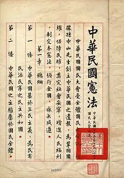 La Constitution de la république de Chine (中華民國憲法) est la constitution fixant le fonctionnement des institutions des territoires contrôlés actuellement par la république de Chine, communément appelée Taïwan. La constitution a été rédigée en 1946 alors que le gouvernement nationaliste du Kuomintang contrôlait encore la Chine continentale, dans le cadre d'une brève tentative de conciliation entre le Kuomintang et le Parti communiste chinois. Elle a été adoptée par l'Assemblée nationale de Chine le , promulguée par le gouvernement national le et a pris effet le .