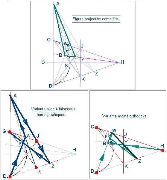 La deuxième variante est moins orthodoxe en ce sens qu’elle met en jeu trois faisceaux de droites (centrés sur D, H, G) mais aussi un quatrième ensemble de droites (les droites WY) qui ne passent pas par un point commun (mais qui en réalité enveloppent une autre conique).