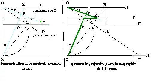 Dans le plan de cette figure considéré comme plongé dans un plan projectif fondamental, on peut établir une (parmi d'autres possibles) transformation homographique entre les deux êtres mathématiques unidimensionnels que sont les faisceaux de centre Z et O. Ceci en se dispensant de travailler sur les échelles de points X et Y. On utilisera H, le point à l'infini dans la direction de l'axe OX et le faisceau de droites de centre H, c’est-à-dire le faisceau des droites parallèles à OX.