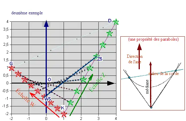 Dans l'ellipse y = 14x2, si W a pour abscisse w, alors la longueur GW mesure (1 – w)√2, la longueur KZ mesure (2 + w)√5, l'élimination de Z entre les deux conduit à la correspondance entre les points des deux échelles: KZ = √5(3-GW/√2), qui n'est qu'un cas particulier et dégénéré de la fonction homographique