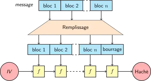 La construction de Merkle-Damgård emploie une fonction de compression avec une entrée et une sortie de taille fixe, et divise le message à hacher en blocs de taille fixe. Les blocs sont ensuite envoyés les uns après les autres dans la fonction de compression. Le résultat de chaque compression est ensuite transmis au bloc suivant selon plusieurs schémas :