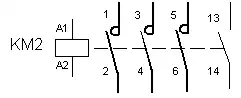 Les contacteurs tripolaires comportent la plupart du temps un contact auxiliaire, tandis que les contacteurs tétrapolaires n'en ont en général pas (la place du contact auxiliaire étant occupée par le quatrième contact de puissance 7-8 non représenté sur le schéma ci-dessous).